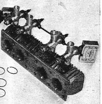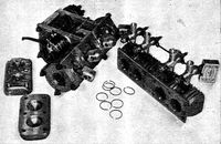 This cylinder block is capped by two cast, light-alloy heads secured by 12 Allen bolts extending down through the block and anchoring into the crankcases. Spark plugs of 10 mm. are used.