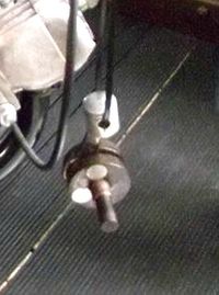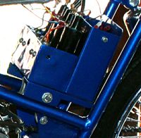 Four tiny home-made mixing chambers, each with a single jet, are fed from two round style, remote float chambers. Each carburettor has a 7/16in. dia. throttle slide with unified control by a link rod and cable to the twist-grip. The matchbox gives some idea of scale.
