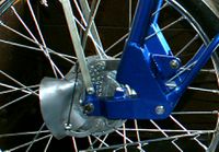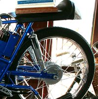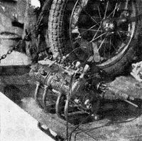 Eric, a staunch supporter of the two-stroke had often sought to justify his pet theory that a two-stroke "multi” is best built compactly using the approach of keying together separate crankshaft assemblies. In this design, where the crankcase is a machined unit from an aluminium plate and not cast, his arrangement is that each crank is carried by a 15/16" o.d. ball journal bearing pressed into each crankcase wall. The separate walls or plates are manufactured from 1/2" alloy plate. The whole is then sandwiched together and secured by lateral through-bolts. (Picture: Comparing the size of the engine against the Fitz-Hugh Tiger Cub wheel.
