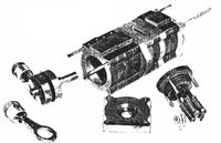 The flywheel and shafts are of orthodox design. Flywheels are pierced for balance, the holes being blanked off by caps to minimize crankcase volume. Pressed-in crankpins carry roller big-end bearings.