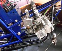 A number of people tried to copy the Fitz-Ray 4 that was created in 1960 but with little success as with out drawings or a prototype guesswork had to be used. Duncan Mitchell, having the F-R engine was ahead of the pack and re-designed some of he parts and built most of the engine, a two-stroke, in a year. Then he made his own diminutive five-speed gearbox. The Bore and stroke are 25.3 x 25mm, compression ratio was 10:1 and maximum power 5 bhp. at 7,000 r.p.m.