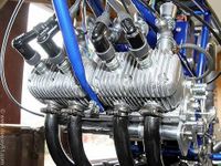 Being of 0.5 inch journal diameter, the crankshaft is built up from Four separate full-disc flywheel assemblies pressed together and supported in eight ball bearing races. Stainless steel connecting rods run on uncaged 3/16" x 3/16" rollers. Pistons are in Y alloy and, like the con rods, are machined from solid.