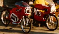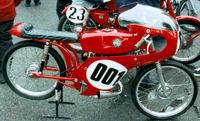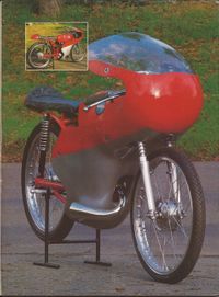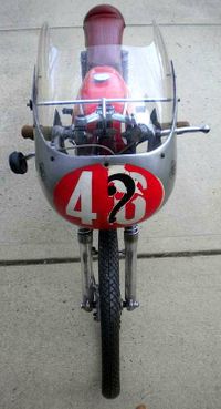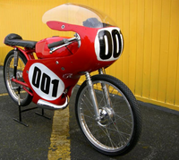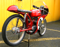 Although prepared in the works racing department, the GP bikes drew heavily on the roadster version for parts, although the frames were specially constructed. Its pedals removed, the single-cylinder two-stroke engine was ported and fitted with a larger carburettor and a deafening megaphone exhaust (known to most as a "Cow Horn").