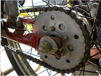 The two-stroke motor came directly from the production moped. It is fitted with a 13-tooth front sprocket and had slots cut into the cases for cooling. The frame was custom built for the bikes and used Campagnolo bicycle headsets. There’s a four-speed (not standard-editor) gearbox operated by an unusual and uncomfortable twist-grip shifter, also taken from the production moped model. The owner reported that the twist grip gear changer is still in place. In at least one other example of the four that were built, the twist-grip shifter was hacked off by subsequent owners in an attempt to replace it with something easier to operate, like a foot change unit.